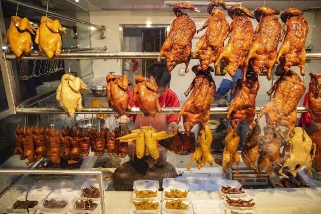 ▲广东烧腊馆,中间的两只即为酱油鸡。在广东话里,“我出鸡,你出酱油”有“我都出了大头,你不要吝啬出小头”的意思