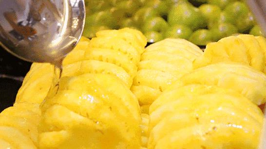 ▲往菠萝上洒甘草汁,相比酱油来说,一点都不黑暗。