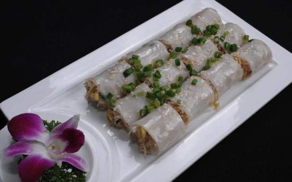 由于猪肠碌外形呈圆条形,貌似猪肠,因而取名字猪肠碌。猪肠碌与粉卷类似,但馅是由豆芽、炒河粉等制成的,以一整张的河粉作皮来包裹。吃的情况下可整条吃,还可以切割成小段,再沾上独特的调味品,味儿咸中带香,非常爽口。还一些沾上牛腩汁,味儿更足。