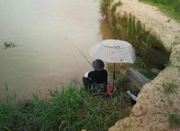 河岸上已经有垂钓者竖起钓竿,撑开雨伞,戴着凉爽的帽子在河边钓鱼,下雨后,东江、浑浊河水中的鱼这时正在想在河上呼气,这也可能是钓鱼的好时机。