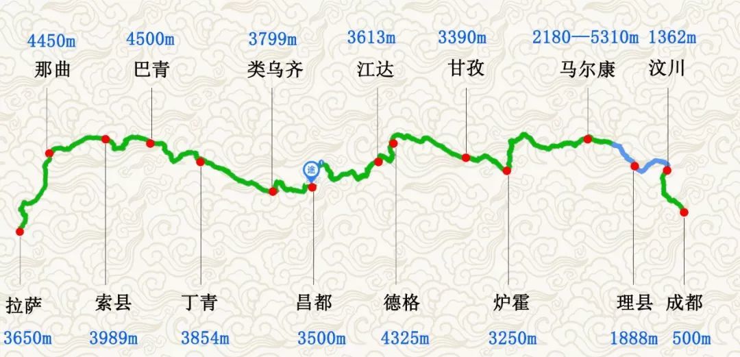 四川成都-郫县-都江堰-汶川-理县-马尔康-炉霍-甘孜-德格-西藏江达-昌都-类乌齐-丁青-巴青-索县-那曲。