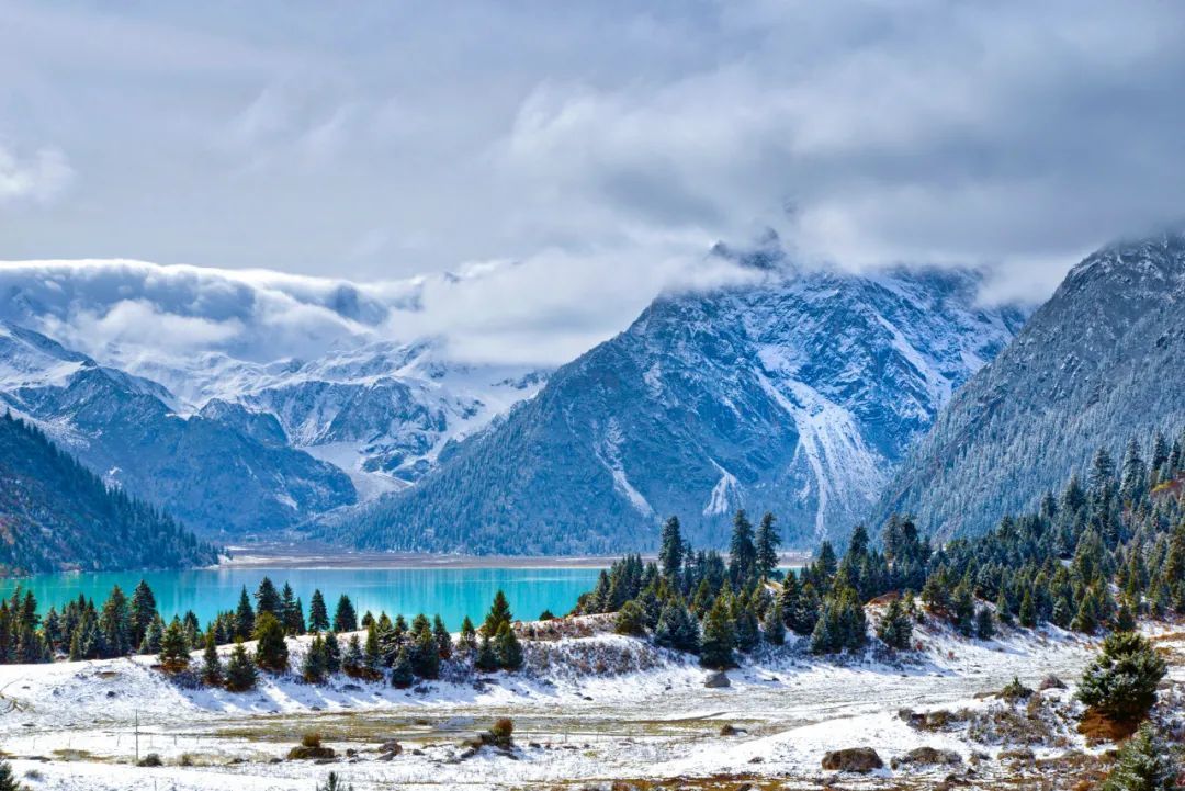 路边有免费的观景台,在这里可以看到那一潭湖水就像是一颗宝石静静的躺在山坳里,雀儿山罗列在湖泊的后面。