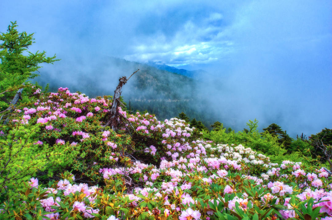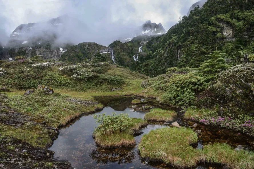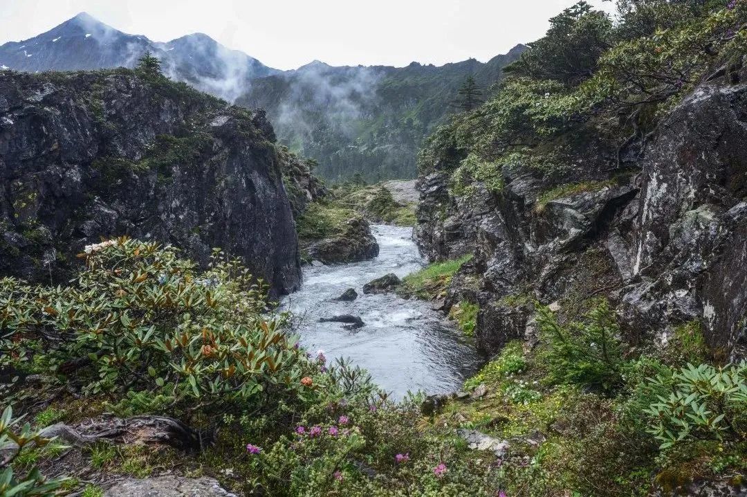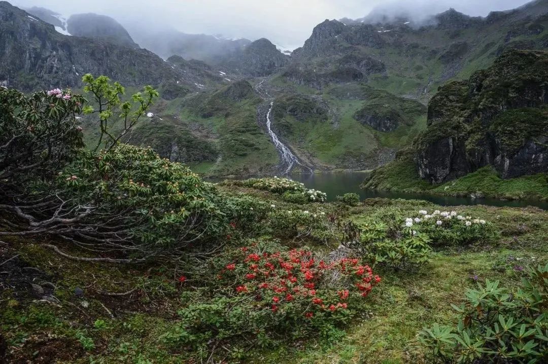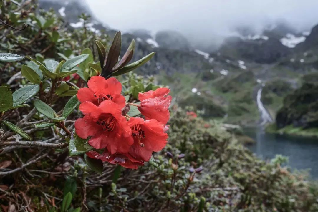 六月是这里美景的开始,冰雪有局部的消融,碧绿的野草密林与湛蓝的天空相映成趣,各种奇异的野花遍地生长,点缀其间。待到6月,湖边的杜鹃花也争相盛开。盛放后景色最为壮观,从湖边到坡上漫山遍野,在青山溪流与迷雾中,尽情绽放着热烈的色彩。