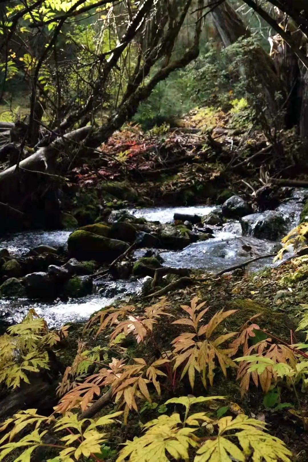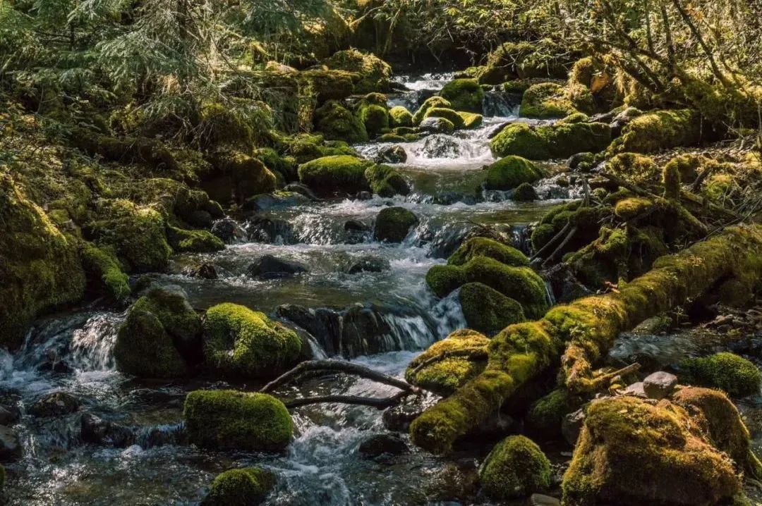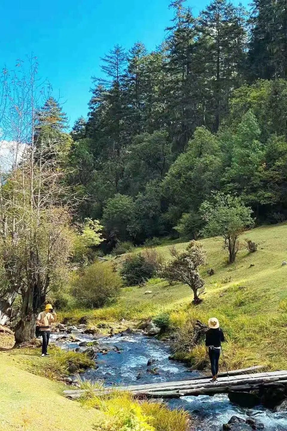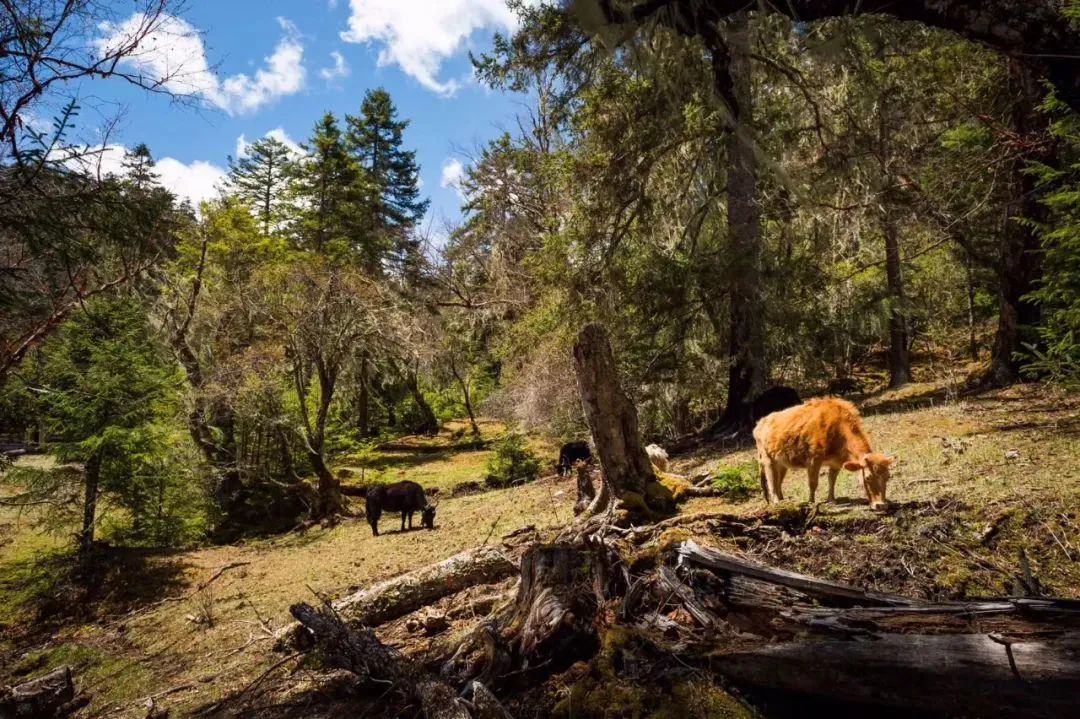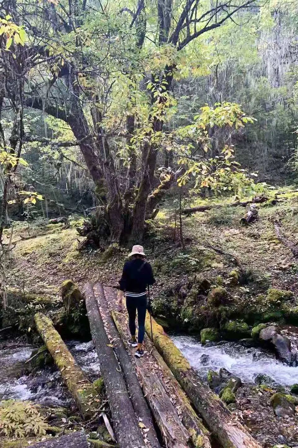 大部分时间,徒步者是沿着山谷间的溪流行走,若是累了可以在古木参天、树枝上挂满松萝的林间草坝子上做小小的休憩,阳光就在眼前的树缝间跳跃。