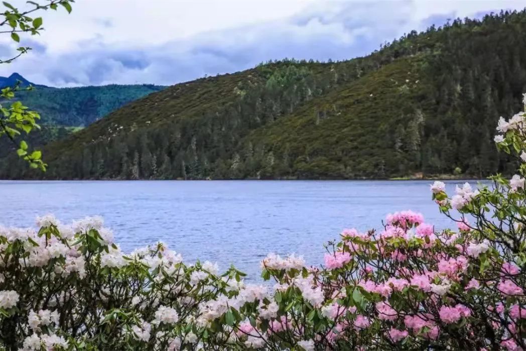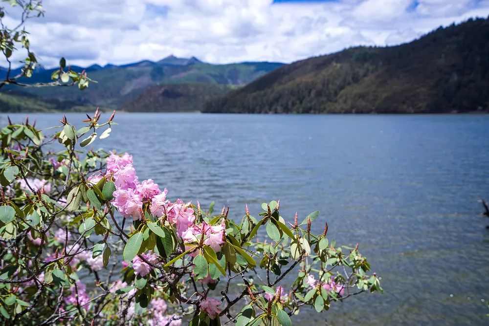 这里的杜鹃品种众多,有如玉般晶莹剔透的白杜鹃,有温柔如水的粉杜鹃,有妖娆艳丽的紫杜鹃。它们一树树、一丛丛、一簇簇,生长在山林岩石边。掩映在绿树中的绚烂花朵,为这片蓝天下寂静的高山碧湖,涂抹上一道亮丽色彩。