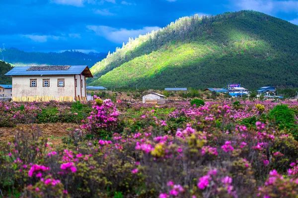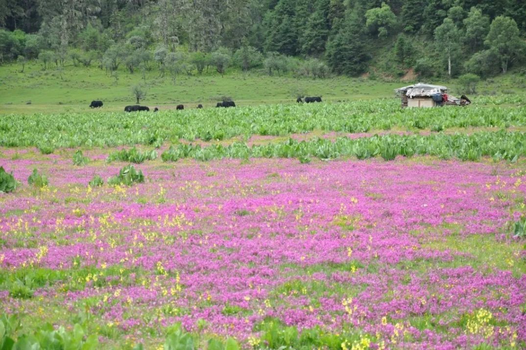 小中甸 地处高寒坝区,本身就是一处高原牧场,平坦的大地拥有成片的茂盛草场。每年5月下旬开始,这里将成了一片花海,目之所及皆是多彩绚烂的杜鹃花、狼毒花、格桑花、还有各种不知名的小花小草……