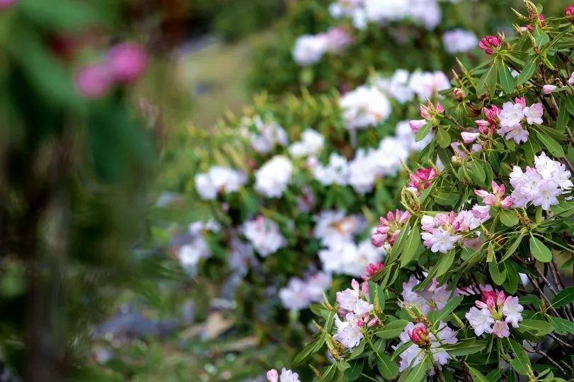 雪山上高山杜鹃林种类丰富,被植物学家称为“北温带植物区系的摇篮”,有密枝杜鹃、金背杜鹃、银背杜鹃、韦化杜鹃、小叶杜鹃等高山名花杜鹃花科植物90余种。从山脚向上徒步时,随着海拔的变化,可以见到各个品种、颜色不一的高山杜鹃。