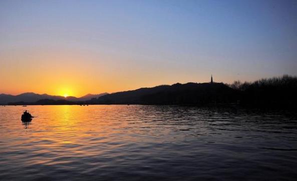 “暮霭沉沉楚天阔”,夕阳将天空染成了金黄色,湖面倒映出天色,好似一幅油墨画,黄昏让人变得懒散,只想坐在亭子中看着云彩由金黄变为蓝紫,夕阳慢慢划落地平线后。这时候的西湖是彩色浓丽的美。