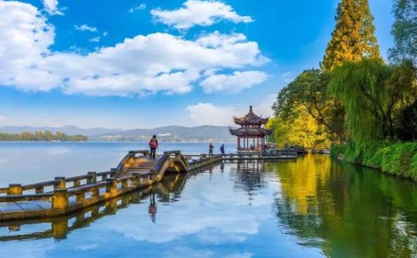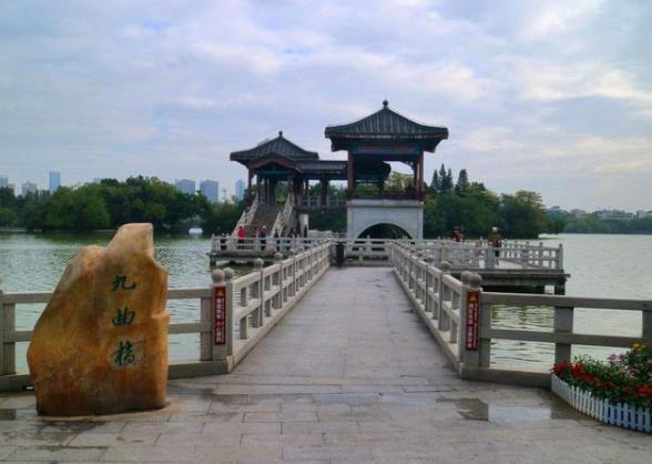 九曲桥在西湖中央,九曲桥九曲十八弯,每个弯曲角度不一样,曲折的桥直达西湖平湖的点翠州,雨过后走在桥上时,桥面被雨水打湿越发显得白,在桥山看着湖里的金鱼一群群游来游去,夕阳洒在湖面,好像置身于一片金海里。